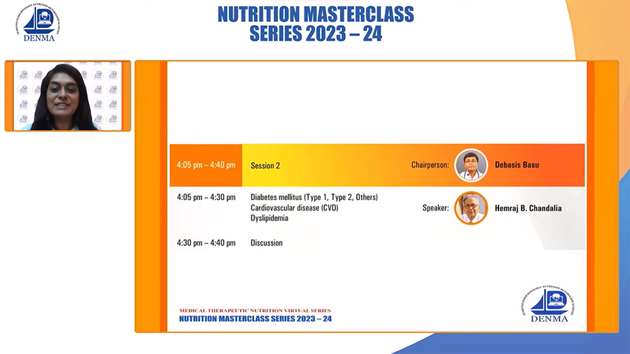 The Medical Therapeutic Nutrition Masterclass Series 2023-2024 was a unique educational series hosted by Diabetes Endocrinology Nutrition Metabolism Academy (DENMA). This online masterclass series was meticulously designed under the guidance of Dr. H. B. Chandalia, who served as the Honorary Academic Mentor for this academic program. It aimed to elevate the expertise of professionals in nutrition, dietetics, diabetes education and other healthcare sectors by covering a broad spectrum of advanced topics and practical applications.